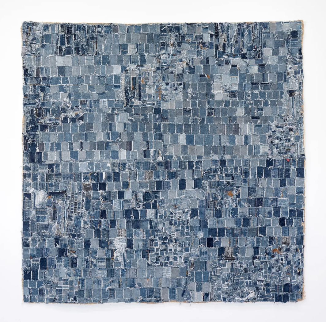 Since 2019, Cyrus has utilized denim as a primary material, transforming discarded jeans and their cotton thread into painterly abstractions. In the artist’s words, he seeks “to use the materials and format of the quilt to document aspects of Black political history.” Whether mining FBI files of Black activists and artists or uncovering lesser-known narratives within the Black American experience, his work acknowledges how adversity and loss can inspire beauty, resistance, and progress, offering an expanded understanding of American history.